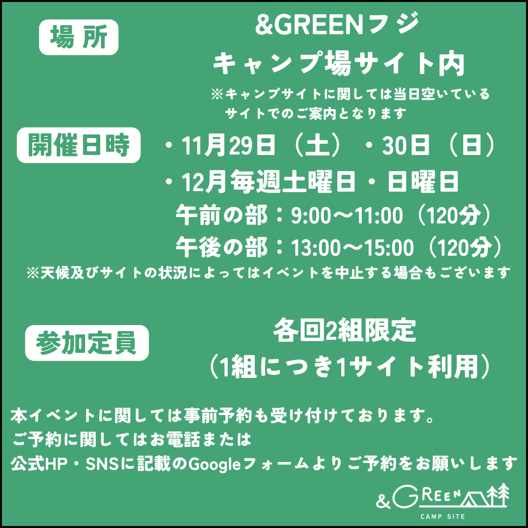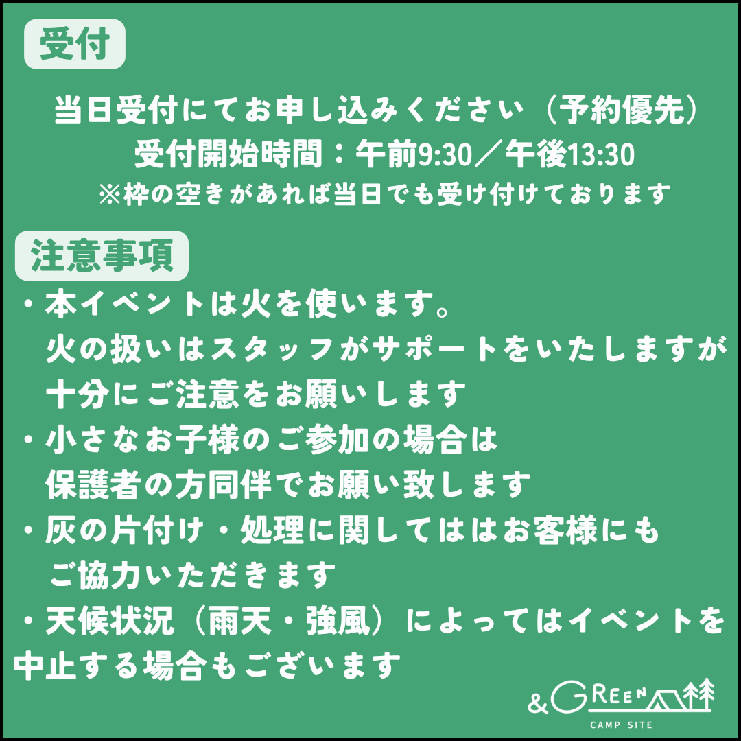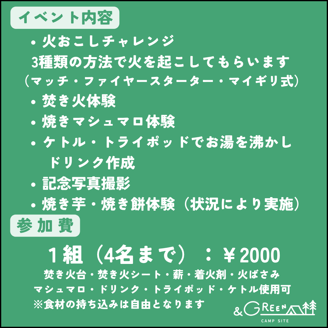 冬のアウトドアの醍醐味である「焚き火」を、しっかり楽しめる体験イベントです。
