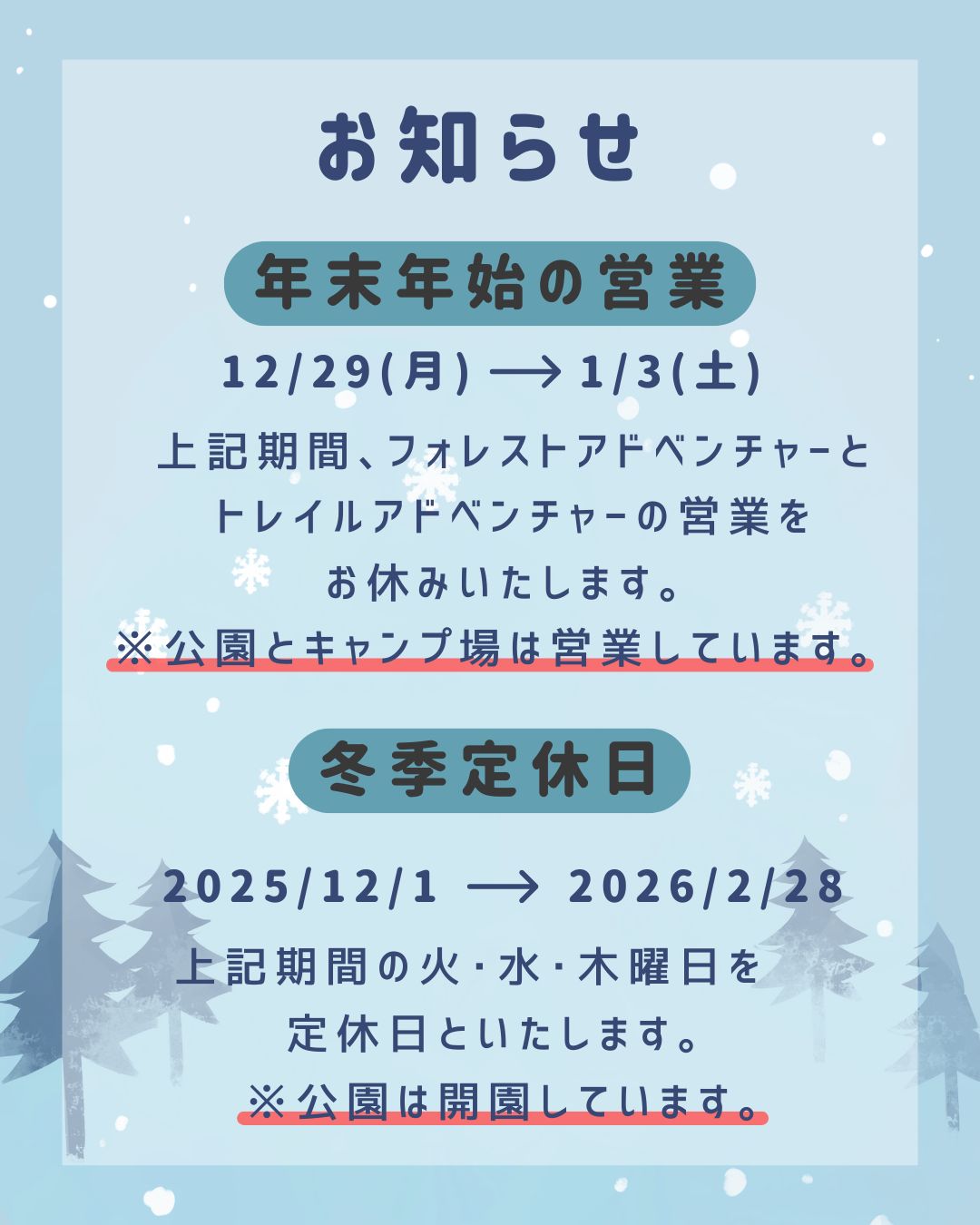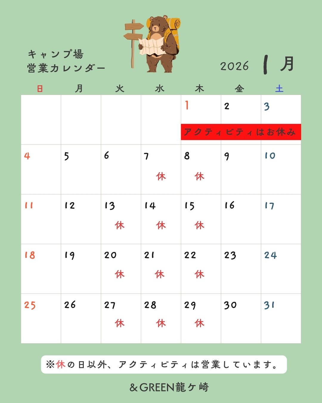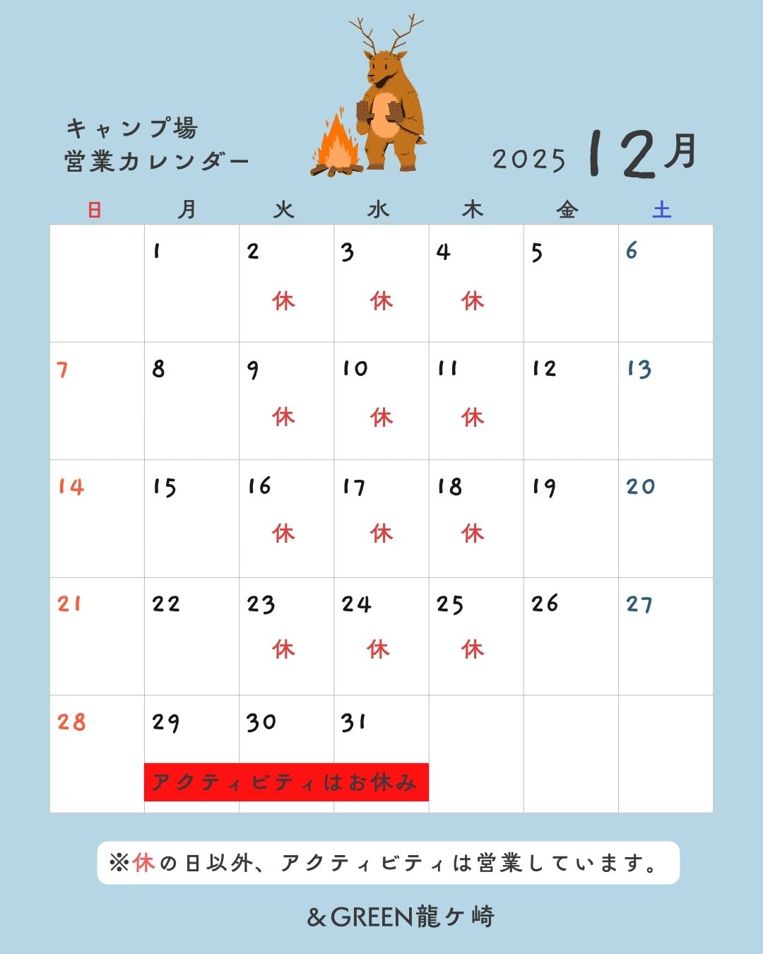 通常フリーサイトは場所指定不可ですが、12月は砂利サイト「Eエリア」を選んでご予約ができます!営業カレンダーは画像からご確認ください📅